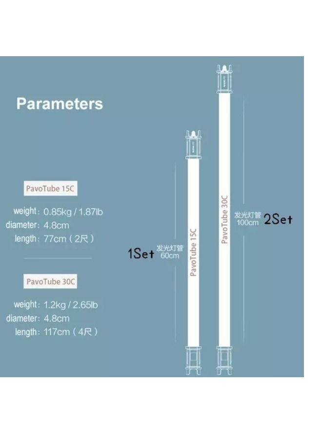 · RGBWW LED Tube · Available in 2 ft and 4 ft Lengths · Diameter: 1.9 inch, T12 Compatible · Color Temp: 2700K-6500K · CRI: 98 · TLCI: 95 · Dimming: 0-100% · Power Source: DC15V 3A, AC 100-240V · Battery: Built in Rechargeable Li-Ion · Battery Run Time: 2.2 Hours of Runtime at 100% Brightness · Wireless Control: 2.4ghz · Connect Multiple Tubes Together via Sync Cord · Pre-Programed Special Effects Including Storm, Flash, Candlelight, and Color Cycle